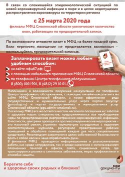 В связи со сложившейся эпидемиологической ситуацией по новой коронавирусной инфекции в мире и в целях недопущения распространения коронавируса на территории региона с 25 марта 2020 года филиалы МФЦ Смоленской области увеличивают количество окон, работающих по предварительной записи