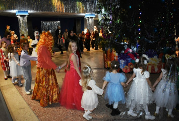 В этом году главные герои театрализованного представления «Новогодний переполох»: Дед Мороз, Снегурочка, Баба Яга, Мачеха, Волк, Красная Шапочка, Буратино, Мальвина, Лиса Алиса, Снеговик, Кощей Бессмертный. Сказочные персонажи вместе с ребятами погрузились в мир волшебства, неожиданных приключений, песен, хороводов, танцев и сюрпризов.