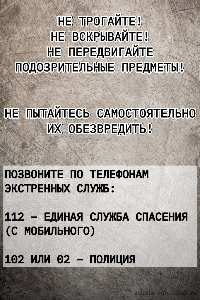 Не трогайте, не вскрывайте и не передвигайте подозрительные предметы. Не пытайтесь самостоятельно их обезвредить!